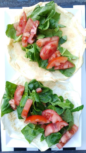 - Extiende la crepe en un plato, esparce las hojas de espinacas y mitad tomate troceado por encima.