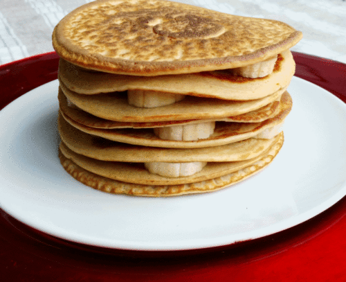 - Pon una tortita en el centro del plato, coloca encima 3 trozos de plátano y cubre con otra. Repite este proceso hasta que no te queden más tortitas.