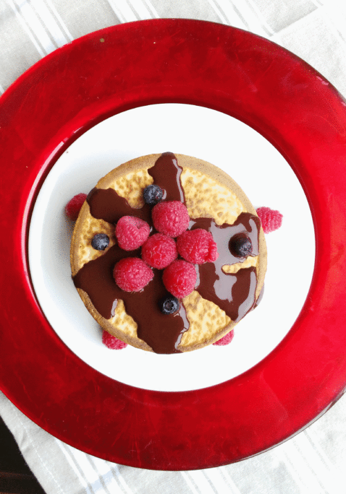 - Derrama el chocolate líquido por encima de las tortitas y decora con las frambuesas y arándanos.